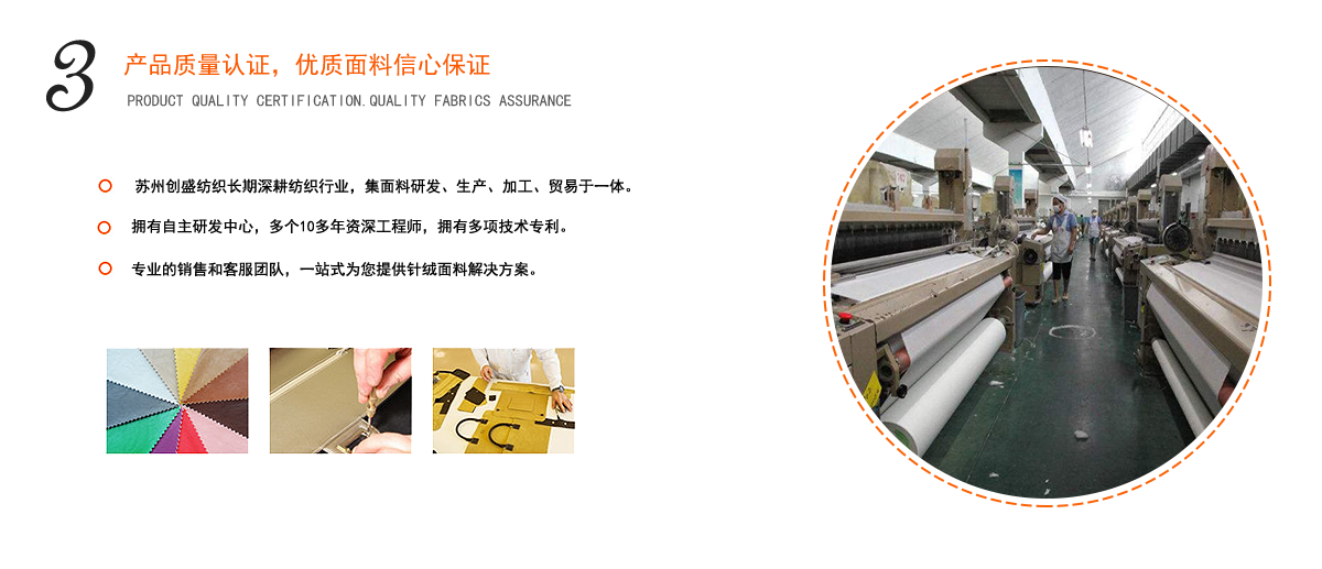蘇州創盛紡織有限公司坐落于江蘇省吳江市盛澤鎮圣塘村,自2004年成立以來,一直致力于中高檔功能型環保梭織面料的研發與經營,創盛紡織在專注幾十年面料經營中,不斷的完善管理,嚴格的把控品質,精準的創新產品,從而讓每一款面料滿足不同客戶的個性化需求,產品廣泛適用于:嬰兒用品、戶外旅行用品、運動休閑用品、箱包手袋、家庭收納用品等領域。